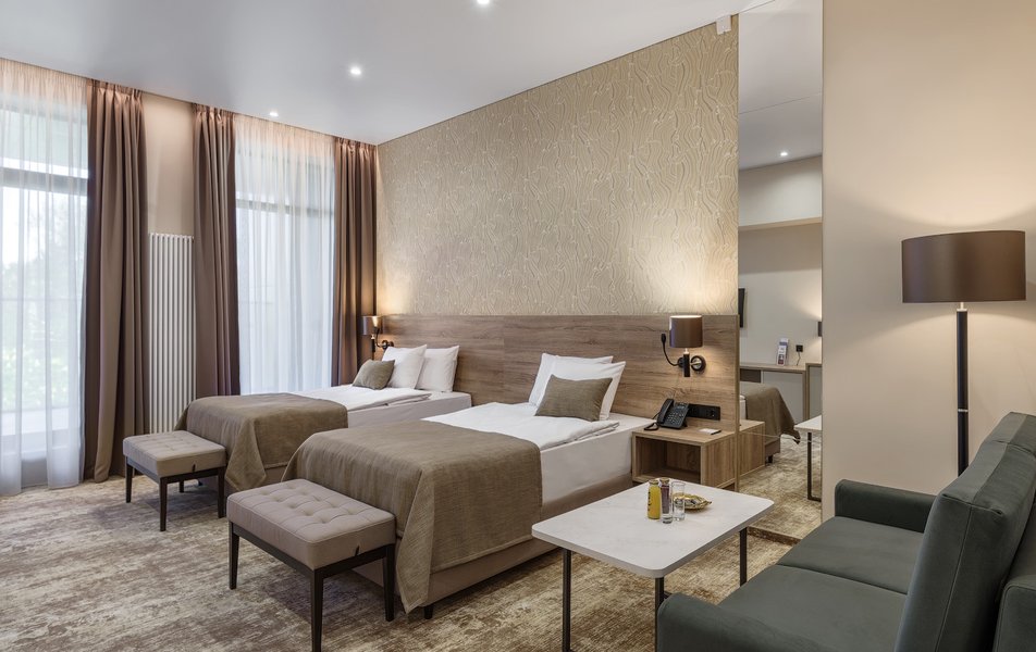 В номере: вешалка, диван, зеркало, кресло, кровать двуспальная, прикроватные тумбочки, стол, шкаф, мини-холодильник, сейф, телевизор ЖК, телефон, чайный набор посуды, электрочайник