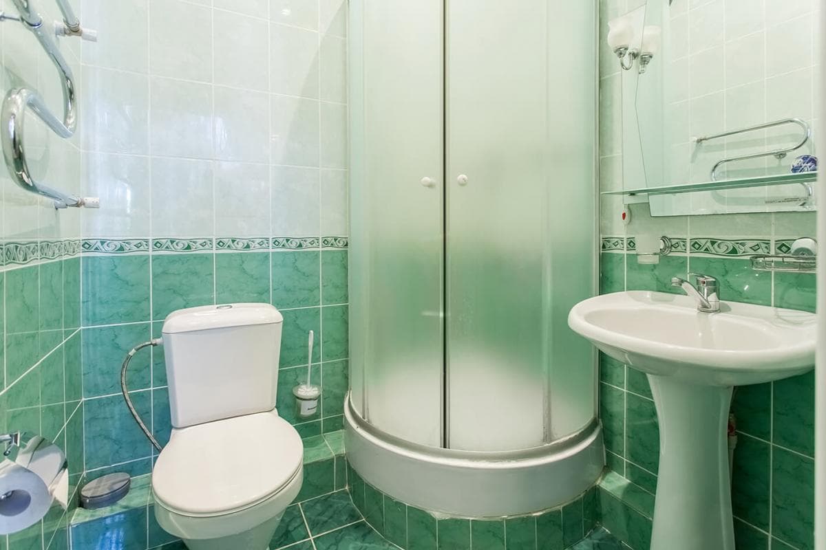 Санузел: унитаз, раковина, душевая кабина, фен