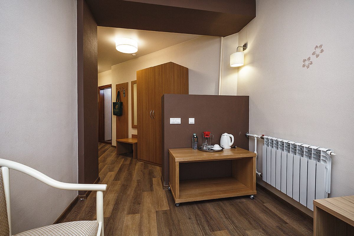В номере: две односпальные кровати или рдна двуспальная, прикроватные тумбочки, шкаф, столик журнальный, туалетный столик, телевизор, телефон, чайник, холодильник, сушилка для белья