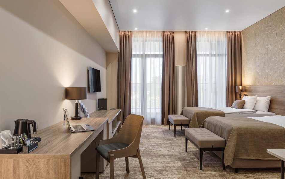 В номере: вешалка, диван, зеркало, кресло, кровать двуспальная, прикроватные тумбочки, стол, шкаф, мини-холодильник, сейф, телевизор ЖК, телефон, чайный набор посуды, электрочайник