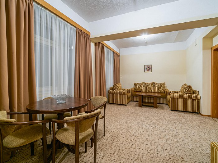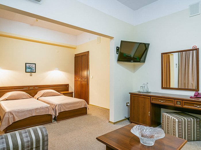 В номере: две комнаты: спальня и гостиная, односпальные кровати или одна двуспальная, прикроватные тумбы, зеркало, шкаф для одежды, мягкая мебель, журнальный стол, сейф, письменный стол, телевизор, кондиционер, фен, холодильник, Wi-Fi