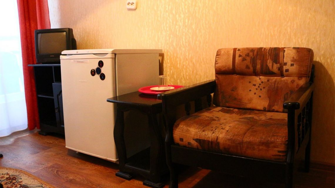 В номере: односпальная кровать, прикроватные тумбы, стул или пуф, стол журнальный, кресло, шкаф, холодильник, телевизор, набор посуды