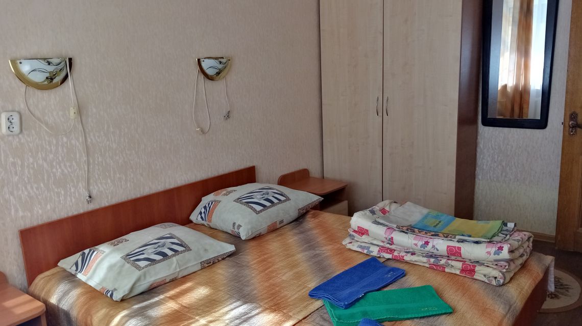 В номере: двуспальная кровать, прикроватные тумбы, стул, стол журнальный, шкаф, холодильник, телевизор, набор посуды