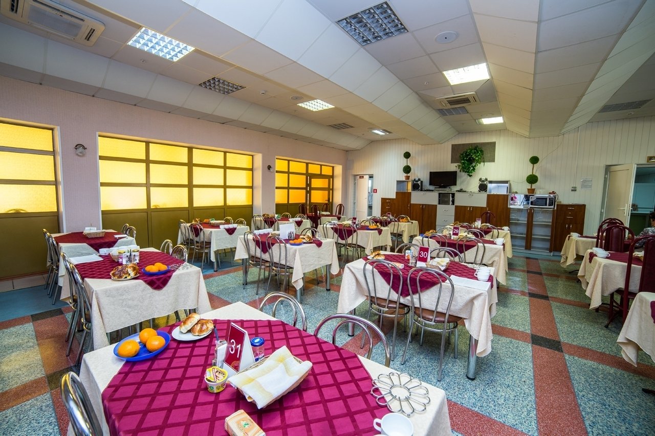 Питание организовано в 2-х столовых. В столовой №1 в двух залах на 50 и 170 мест. В столовой № 2 в двух залах на 140 и 200 мест. Все обеденные залы имеют кондиционер.