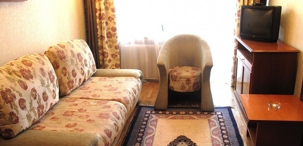 В номере: две 1,5-спальные кровати, тумбочки, бра, коврики, туалетный столик, два встроенных платяных шкафа, ТВ, кондиционер, радио, выход на балкон (летняя мебель).